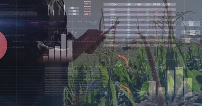 Analyzing crop health woman using tablet in corn field, with chart overlays, copy space