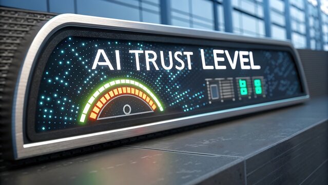 Futuristic digital meter displays ai trust level with gauge and indicators
