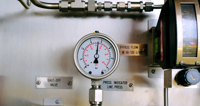 Pressure gauge of co2 calculator on gas process. Wellhead platform.Pressure gauge