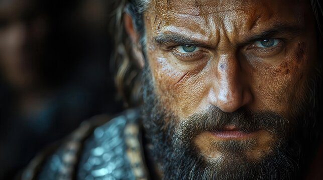 powerful portrait of vercingetorix fierce gallic warrior chief intricate celtic armor wild hair and beard determined gaze