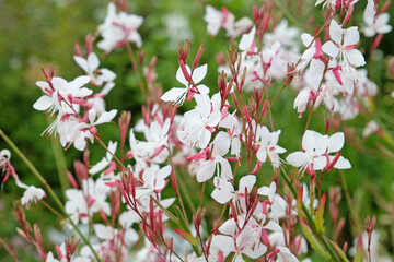 Tender white Gaura lindheimeri flowers blossoming on flower bed on sunny summer day.