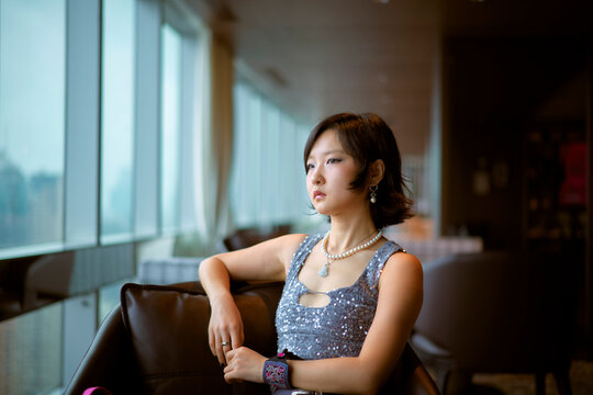 Woman in a shimmering dress sits on a leather chair by a large window, gazing outside.   Shanghai, China