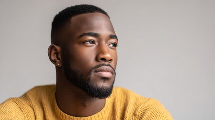 focused carpenter portrait positioned to right gazing thoughtfully into distance