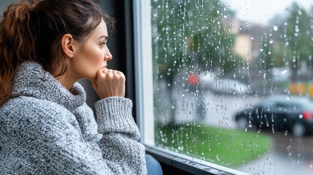 A person is shown looking contemplatively through a rainy window, lost in thought while the raindrops on the glass capture the essence of a calming yet reflective moment.