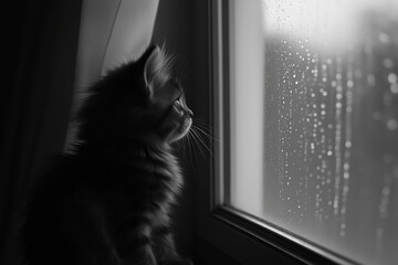 A child sitting by a window on a rainy day, gazing outside sadly.