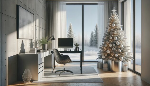 Amidst the bustling holiday season, a cozy room with a decorated christmas tree stands adorned with a mockup picture frame, while a busy worker can sit at their desk, gazing out the window
