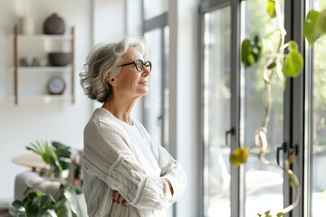 An elderly woman in glasses smiles contentedly while gazing out a sunny window, embodying peace and contemplation in a light-filled, modern interior.