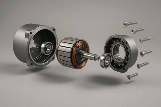Disassembled electric motor with visible rotor, stator, shaft, and screws, shown in realistic style on a neutral background, concept of mechanics
