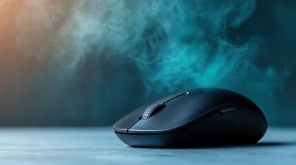A sleek black computer mouse creates a striking visual against a backdrop of swirling smoke, merging technology and artistry in a captivatingly modern scene.