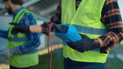 Workers test solar panels with equipment at a renewable energy site in the afternoon sunlight while wearing safety gear