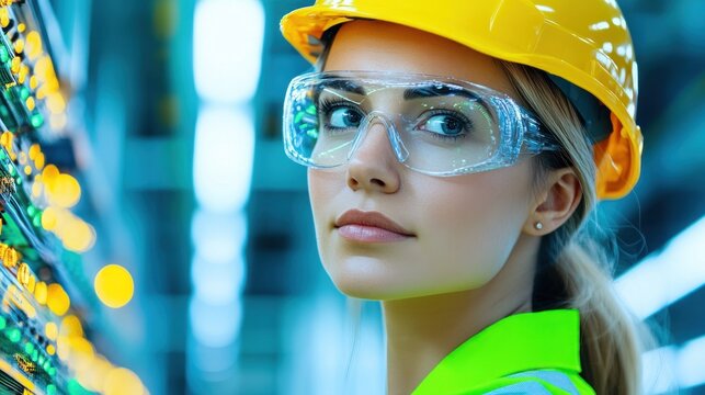 Technician inspects complex electrical panels while wearing safety gear in an industrial environment.