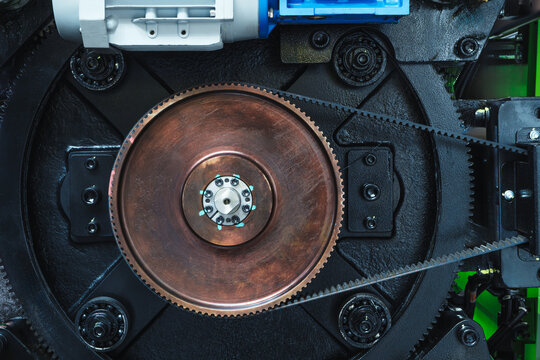 Close-up of a machine with a brown gear as part of a large industrial mechanism, belt transmission.  gear is surrounded by other gears, and the machine itself is black. Industrial concept background