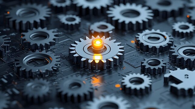 A single gear within a group of interconnected metallic cogs and gears glowing brightly representing a key or pivotal concept or idea among a larger complex industrial or technological system