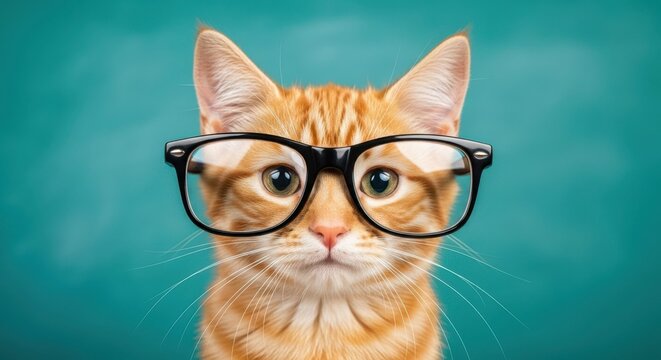 Smart Cat: A curious ginger cat dons spectacles, exuding intelligence and charm. Its captivating gaze draws you into a world of wisdom and wit.