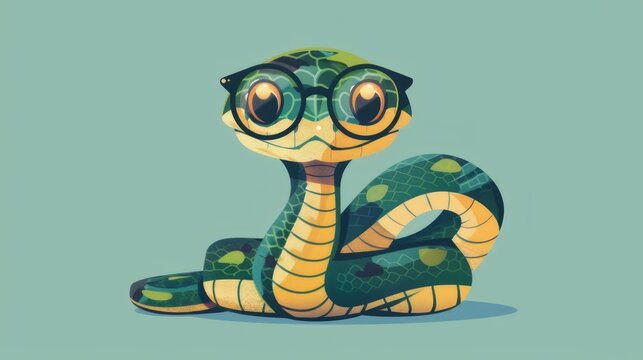 Illustration in flat style, A cute little snake wearing glasses posed against a studio background