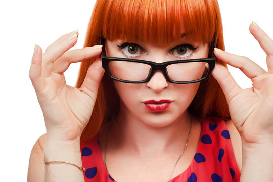 Pair of women's glasses with a black cate eye shape frame isolated on a plain white background. Copy space. Eyesight concept.