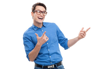 Studio photo of a very happy and geeky blonde girl with glasses pointing up on yellow background.