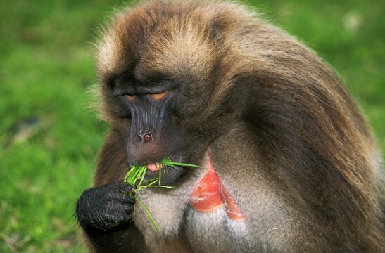 Portrait of monkey gelada, Theropithecus gelada, the bleeding-heart monkey, gelada baboon. Communication of male and female
