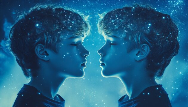 Captivating night sky  gemini constellation represented by twin boys under a blue starry canopy