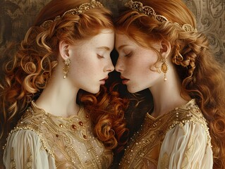 Two heads, gemini zodiac, mystic sky with clouds and glowing or burning elements