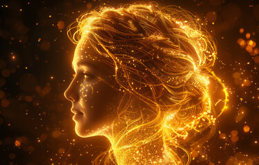 Virgo zodiac sign with a stylized image of a young woman in golden lights on a starry background.