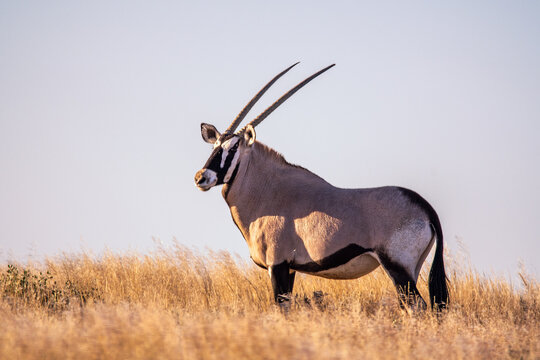 Portrait of a pair of gemsbok (oryx) antelopes lookling in one direction in yellow dry winter grass and clear blue sky, Etosha National Park, Namibia
