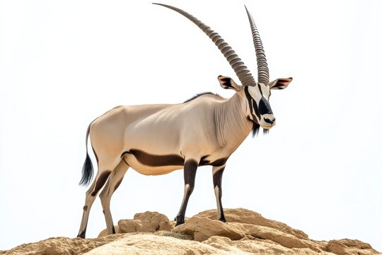 Wild Arabian Oryx and gemsbok on white backdrop Large antelope in savannah habitat featuring prominent straight horns