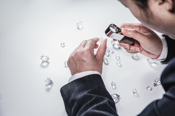 Businessman jeweler during the evaluation of jewels with magnifier. Jeweler looking at diamonds or Luxury stone through loupe evaluating gem a symbol of business success or successful finance concept
