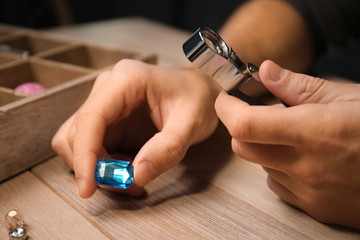 Appraiser with loupe evaluating gemstone at table indoors, closeup