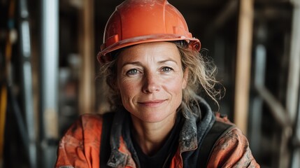 A skilled woman construction worker, confidently wearing an orange hard hat and work attire, stands ready on a construction site, showcasing empowerment in non-traditional roles.