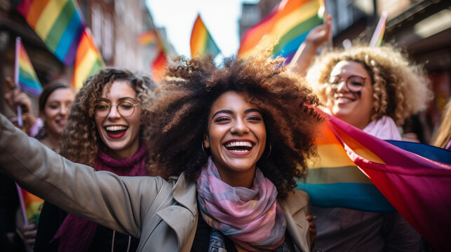 Group of LGBTQ+ people celebrating with pride flag, photography.