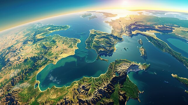 Physical map of Planet Earth, centered on the Mediterranean Sea. Satellite view of Southern Europe and North Africa with the sun shining on the horizon. 3D illustration.