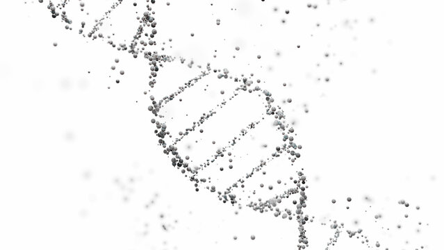 3D rendering of a DNA molecule in white with particles against a light background, scientific purity and genetic analysis.