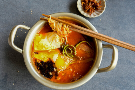 Homemade Korean Cuisine. Kimchi Ramyeaon aka Spicy Kimchi Noodle Soup. Ingredients are mostly available at Korean supermarket but some can be substitute with local availability.