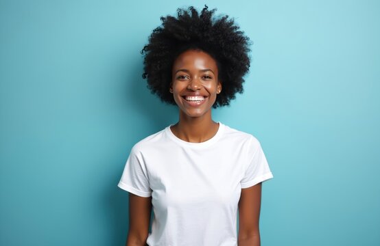 Portrait of happy black girl in white tshirt. Woman smiles broadly showing white teeth on blue backdrop. Positive emotions and good mood concept. Model posing in studio. Space available for text.