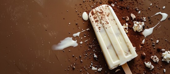 A top down image of a mostly consumed milkshake flavored popsicle on a brown backdrop with a blank space for other elements. copy space available