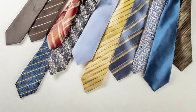 Ties in different colours and patterns, mostly made of silk, on a light background. Elegant and formal atmosphere, AI generated, AI generated