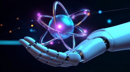AI generates nuclear energy. A futuristic robot arm holds an atom with a neon glow