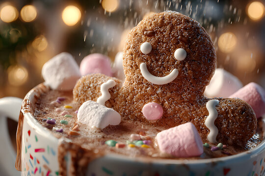Gingerbread man in a cup of hot chocolate or cocoa. AI generated