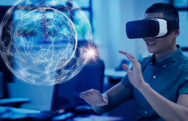 Computer programmer testing virtual reality simulator glasses, viewing projection hologram