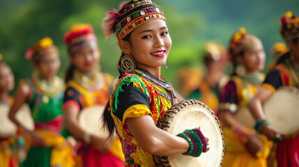 atmosphere of Wangala Festival in Garo village, dancers wearing brightly colored traditional clothes with headbands and jewelry, Ai generated images