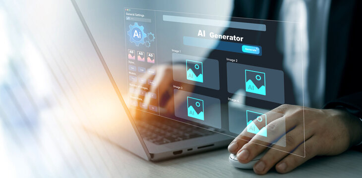 Person using AI software to generate images with futuristic platform user interface. Image AI generator conceptArtificial Intelligence Image Content Generator.AI image creation service technology.