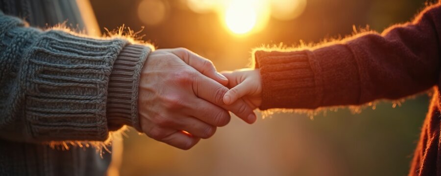 Elderly grandfather holds grandchilds hand at sunset. Gentle touch symbolizes family love, generational connection, and cherished moments. Golden hour light creates warmth and hope for the future.
