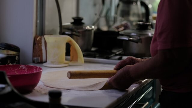 Wrinkled hands skillfully prepare dough on a floured surface, with kitchen utensils in the background. This moment captures the patience, love, and experience passed down through generations in home