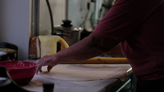 An elderly person's hands carefully stretch dough on a kitchen counter, surrounded by baking tools. This image reflects home cooking traditions, the warmth of family recipes, and the skill of handmade