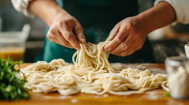 Chef Making Homemade Pasta Hands with fresh Noodles on wood surface, Cooking, Italian food