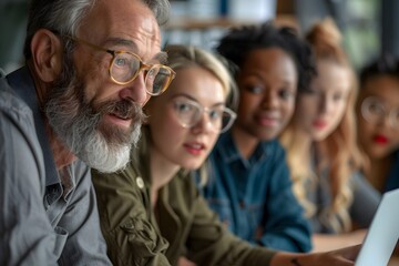 Senior learning digital skills while adult guiding on laptop with magenta ar swirl