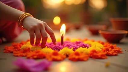 Dashahra, India. Child and Adult Hands Creating Rangoli Together with Flower Petals
