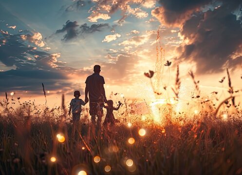 Family strolling on serene beach at sunset