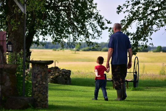 Elderly man holding grandson’s hand while walking in countryside garden with green grass and trees. Generational bond, family love, rural lifestyle.